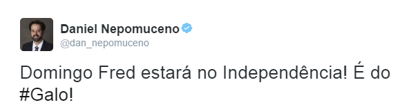 Através do Twitter, o Presidente Daniel Nepomuceno confirmou na noite desta quarta-feira a contratação de Fred pelo Galo. "Domingo Fred estará no Independência! É do #Galo!" - postou o Presidente.