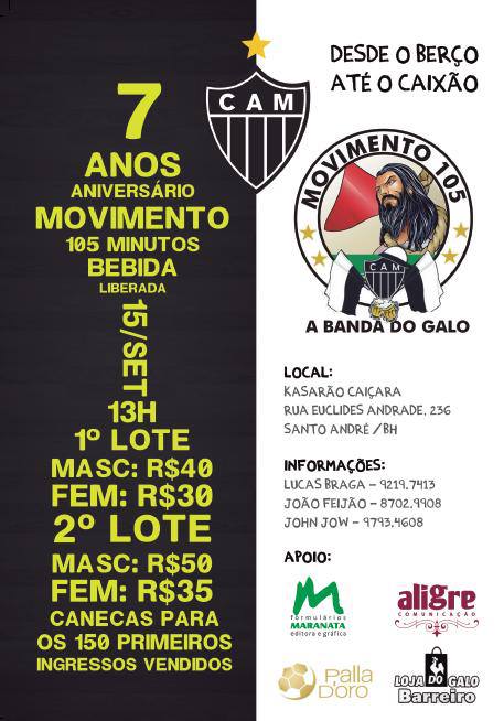 Aniversário do Movimento 105 Minutos Por: Fael Lima 19/08/2013 - 23:58 Adquira já o seu ingresso para a Festa de 7 anos do Movimento 105. Caneca para os 150 primeiros vendidos. Haverá sorteio de camisas do Galo (cortesia Palla D'oro e Loja do Galo Barreiro). O GALO É AMOR, NÃO É SIMPATIA