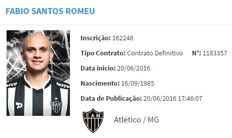 O BID (Boletim Informativo Diário da CBF) publicou, na tarde desta segunda-feira, o contrato de Fábio Santos com o Atlético. O lateral de 30 anos, que estava no Cruz Azul, do México, assina com o Galo até dezembro de 2018.