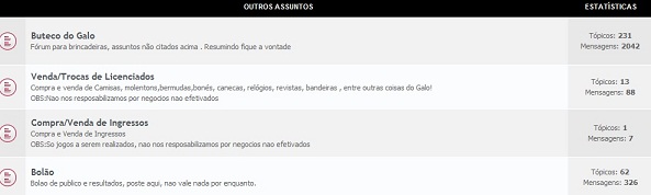Existem tópicos sobre notícias do clube, sobre as divisões de base e até mesmo o futebol feminino do Galo ganhou seu espaço por lá. Quer negociar uma camisa, desistiu do jogo e quer vender seu ingresso? O Forum do Galo te ajuda em tudo isso, com divulgação no twitter de cada postagem.