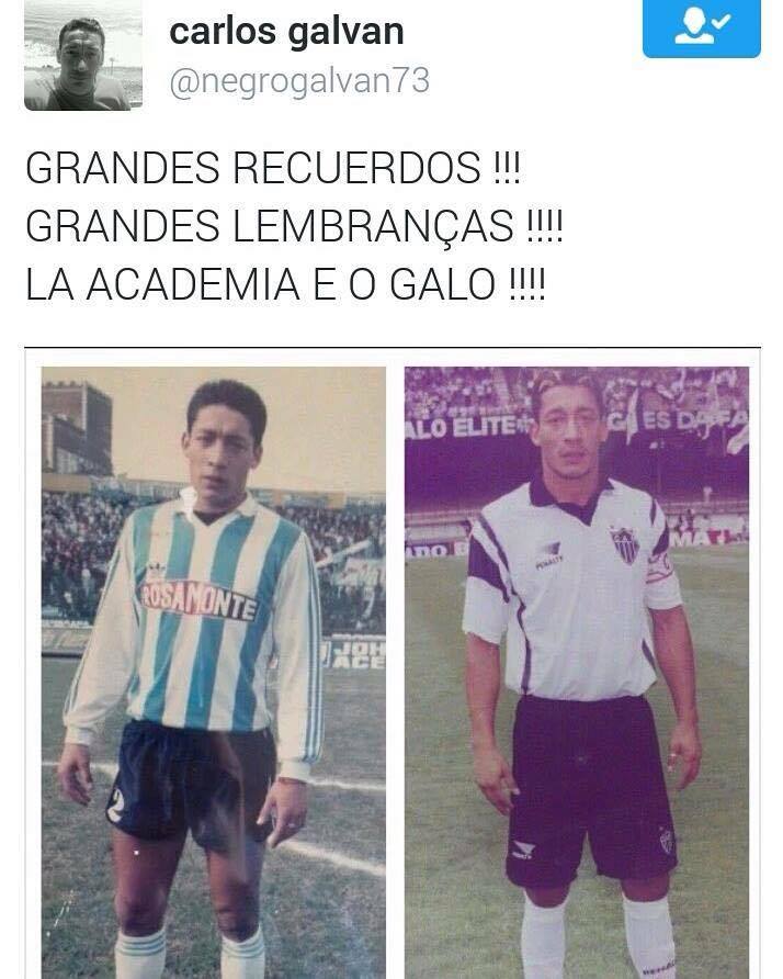 Campeão Mineiro em 1999 e vice-campeão Brasileiro pelo Galo, Galvan aproveitou o confronto entre Atlético e Racing, pela Libertadores, para relembrar o período em que vestiu a camisa das duas equipes. "Grandes recuerdos!!! Grandes lembranças!!! La academia e o Galo!!!", postou Carlos Galvan (@negrogalvan73) em sua conta no Twitter, nesta sexta (22).